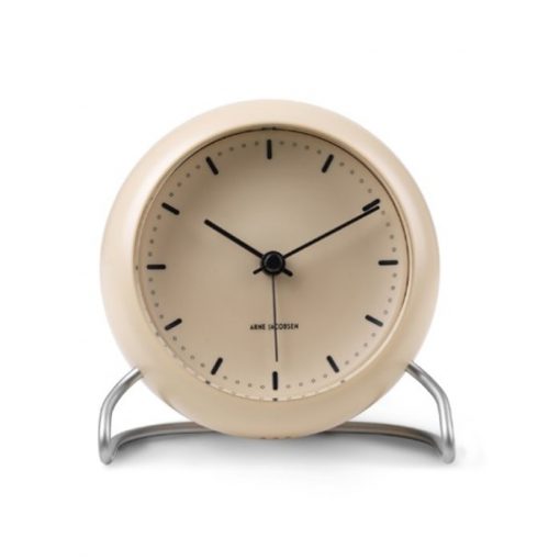 Arne Jacobsen’s City Hall table clock was originally designed for Rødovre Town Hall in 1956. What makes the City Hall clock so popular is its universal expression, which is why it was obvious to make a table clock version of it. As well as adding a decorative touch anywhere in a home, the clock also has all the necessary alarm-clock features, such as alarm, snooze and light. Thanks to a sensor, you can activate both light and snooze by a slight movement of the hand above the clock. The table clock illustrated here is in sandy beige.