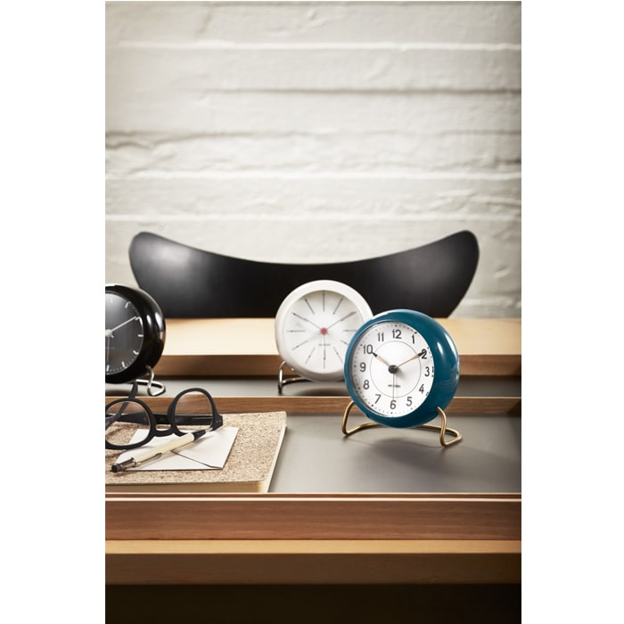 Arne Jacobsen’s Station table clock is ideal as an alarm clock with useful detailing in a calm bedroom, as a colourful element in the bathroom or as a stylish detail in a bookcase in the living room. With its classic styling, the clock makes an ideal gift for all design aficionados. Arne Jacobsen created the Station table clock in 1939 in connection with a project for the electrical goods manufacturer LK. Since then, the table clock – with reference to the original drawings – has been updated to bring it in line with today’s standards for alarm clocks. Accordingly, the clock has a light and a snooze function, both controlled touch-free thanks to an invisible sensor at the top of the clock.