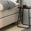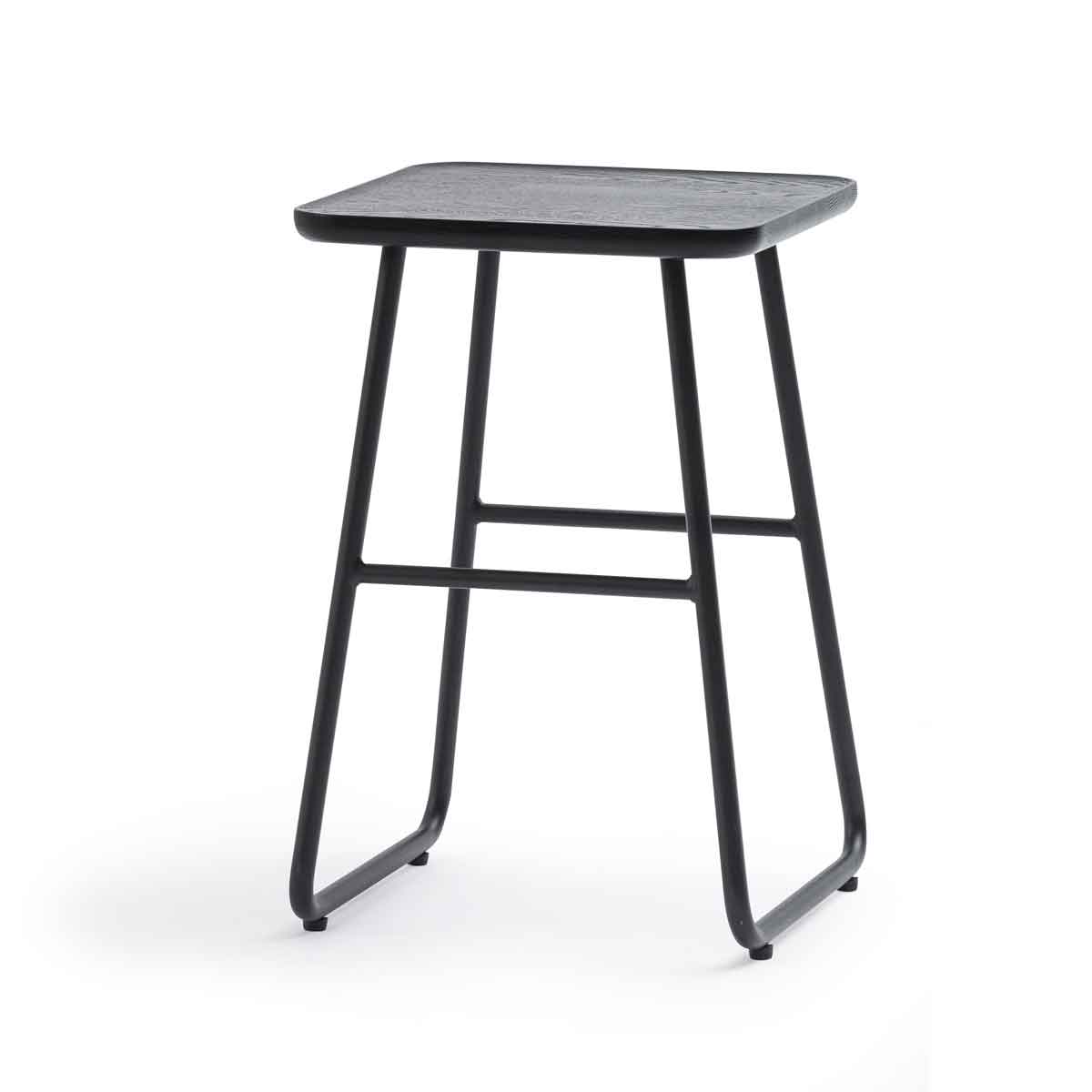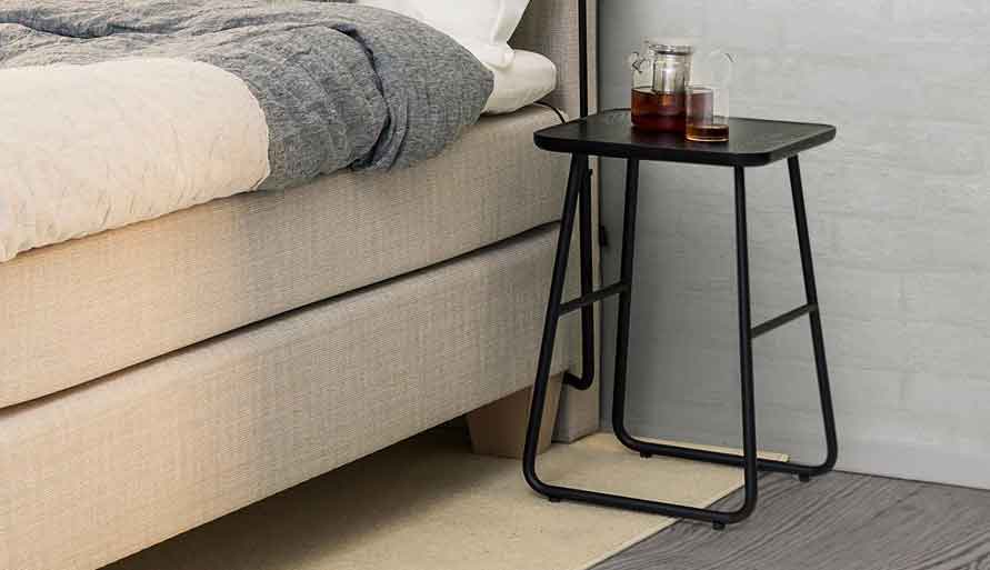 A floor-standing bedside table with a solid wood top. Available in four finishes: oiled oak, white washed, birch and black. Black powder-laxquered steel legs. H 58 cm, top: 38 x 38 cm.