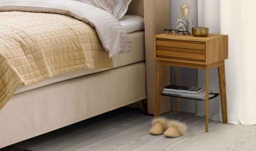 Bed side table in solid wood. Comes in three different wood finishes: oak, white washed and black. Exciting leather details and practical interior clasp for a charging cable. Dimensions: W39 x H62 x D34,8 cm.