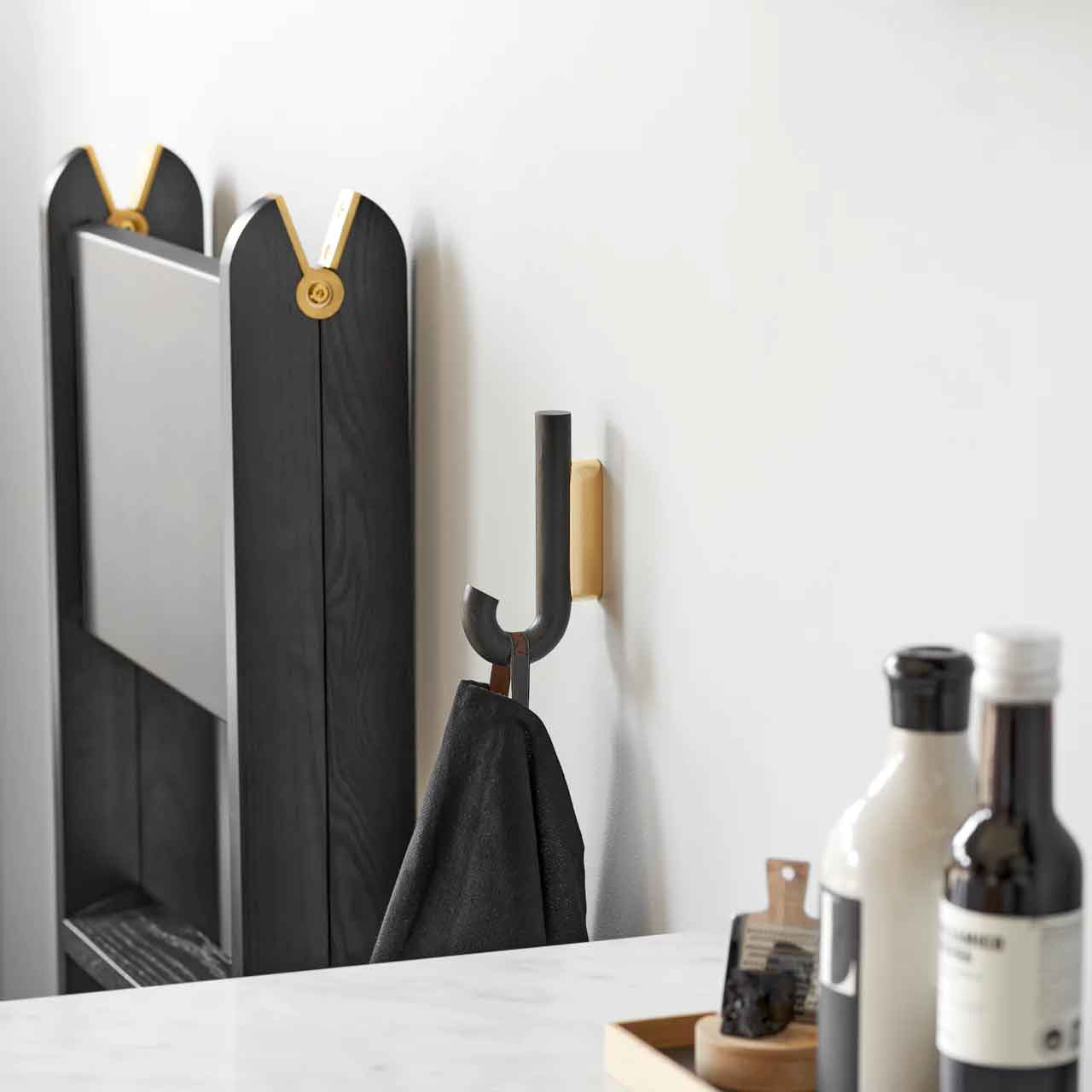 Hook mini is a discreet and beautiful addition to your home interior. The straightforward design invites everyone to hang their jackets, bags, or umbrellas in the hallway. Hook mini can also hold tea towels or aprons in your kitchen or organize towels and bathrobes in your bathroom. The hangers are available in black oak, warm walnut or oak treated with white pigment and matt lacquer, all with beautiful details in wood, while the fittings are available in brass, chrome, and black metal.