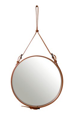 In 1950, Jacques Adnet formed a partnership with a famous French fashion house, where he developed a collection of discreet yet voluptuous leather-covered furniture and interior accessories. Known for being an innovative thinker, Adnet was one of the first designers to combine leather with glass. Accordingly, he designed the elegant, distinctive round leather mirror with equestrian inspired detailing – the Adnet Circulaire Mirror. Besides the remarkable leather and burnished brass details, the mirror in three sizes is also unique as the strap holding the mirror is in direct proportion to the dimension of it.