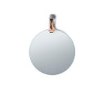 Rope Mirror is a round mirror suspended from a long leather strap. Made from butt leather, the strap adds a distinctive touch to the minimalist design.