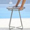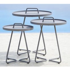 Cane-line and the Danish design team Strand+Hvass decided to make a smaller version of the side table that could both be used together with the larger version and of course as a stand alone side table. The idea behind the design was to create a multifunctional side table with a loose tray. The Danish designers created a unique solution where the table top can easily be lifted off and used to carry drinks from the kitchen to the terrace. An easy to grap handle secures that the One-the-move table can be moved indoors after use. It is made in 100% aluminium thus it is designed to all-year usage outdoor. However, to minimize cleaning and keep the overall look of the product for many years, we recommend to store it indoors during the winter time.