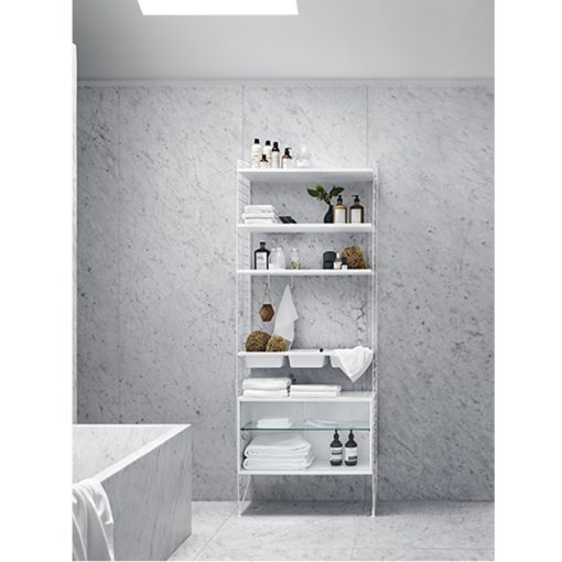 String System cabinet furniture. Easy to wall mount the cabinet with sliding doors. The sliding shelves are smooth and easy to open and close. By adding a cabinet to your String system solution, you add extra storage space in no time.