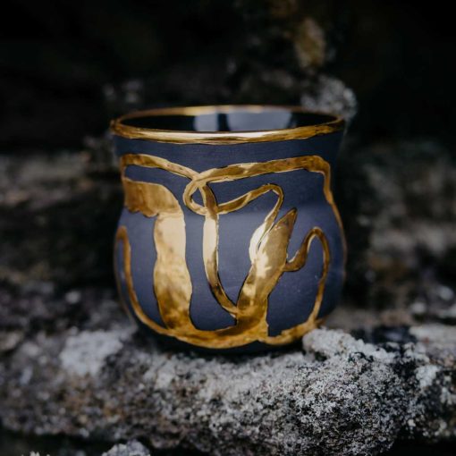 Veltibollinn með mynstrinu Flæði er mótaður úr svörtu hágæða postulíni og er mynstur bollans handmálað tvisvar með þykkri og glansandi 24 karata gyllingu.