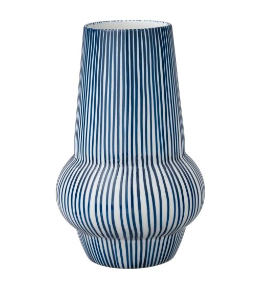 Strýtu vasinn með mynstrinu Foss er mótaður er úr hágæða postulíni og handmálaður í hinum mest einkennandi og klassíska bláa lit Ingu Elínar. Vasarnir eru tilvaldir fyrir þá sem eru að safna öðrum verkum eftir Ingu Elínu.