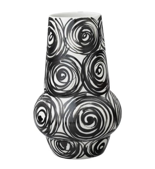 Strýtu vasinn með Baugur mynstrinu er mótaður úr hágæða postulíni og er vandlega handmálaður með svörtum lit á hinn hvíta og náttúrulega lit postulínsins. Vasarnir eru tilvaldir fyrir þá sem eru að safna öðrum verkum eftir Ingu Elínu.