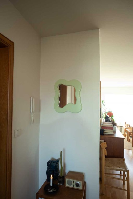 Glazed mirrors er hönnunarlína eftir Salóme Hollanders sem samanstendur af þremur gerðum spegla:original glazed mirror, mini glazed mirro og tall glazed mirror.Grunnformin og geómetrísk abstraktlist hafa lengi heillað Salóme og því er formlögun speglanna byggðá einu grunnformanna, hringnum. Með skörun hringformsins í ólíkum stærðum taka speglarnir á sigósymmetríska og flæðandi lögun. Speglarnir eru lakkaðir með slitsterku háglanslakki og eru fáanlegir í sjömismunandi litum. Háglanslakkið gefur speglunum mjúka og gljáandi áferð sem dregur fram bogadregnarútlínur þeirra. Salóme hannar og framleiðir hvert eintak hér á Íslandi í samstarfi við fagaðila og því fermikil ást, vandvirkni og tími í gerð hvers spegils. glazed mirros skapa nýja breidd í tilveru þína og stækkajafnframt vídd rýmisins. Vonin er að speglarnir kveiki forvitni gagnvart okkur sjálfum og umhverfi okkarásamt því að bjóða leik og ný form velkomin inn á heimilið.Salóme Hollanders (f. 1996) lauk BA-námi við Listaháskóla Íslands í vöruhönnun vorið 2022. Verk hennarliggja gjarnan á mörkum hönnunar og myndlistar, þar sem hún kannar rýmið sem skapast við skörunsviðanna tveggja. Salóme hefur tekið þátt í sýningum hérlendis og erlendis sem hafa vakið mikla athygli.