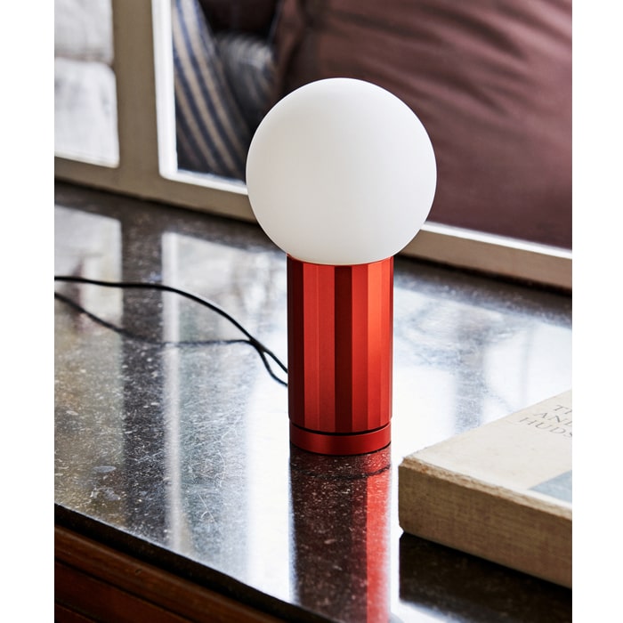 A beautifully unified piece of design made from aluminium and opal glass. The base is a faceted cylinder that works as both the light switch and the stem that holds the spherical glass diffuser in place. Turning the base in a clockwise direction clicks the LED light on, with further rotation increasing the lumen output. This movement built into the design, allows the user to intuitively brighten or dim the light. The base comes in four anodised finishes: black, aluminium, orange or green. Turn On is a design made at human scale, effortlessly simple and pleasing to touch.