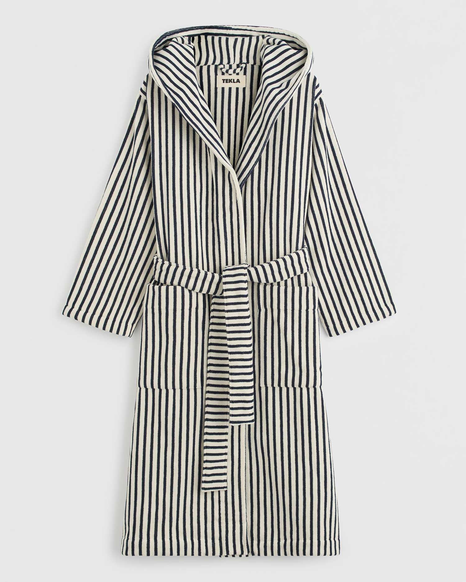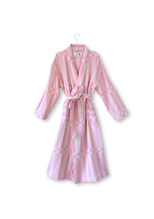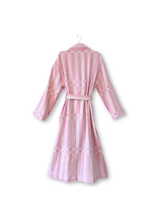 Baðsloppurinn í Brautar munstrinu er jaquard ofinn úr tyrkneskri bómull. Sloppurinn er með tveimur stórum vösum, kantar á vösum, hálsmáli og handvegi eru með uppábroti.