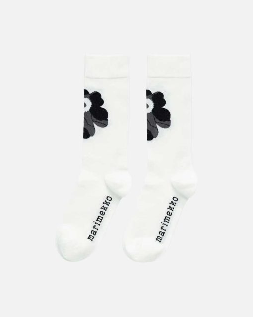 The Toimisto rib knit ankle socks are made of a cotton blend, and they feature one large Akvarelli Unikko pattern flower, which looks like it was painted with watercolours. Socks has Marimekko logo text on the bottom of socks.