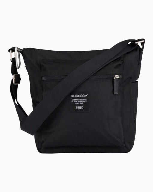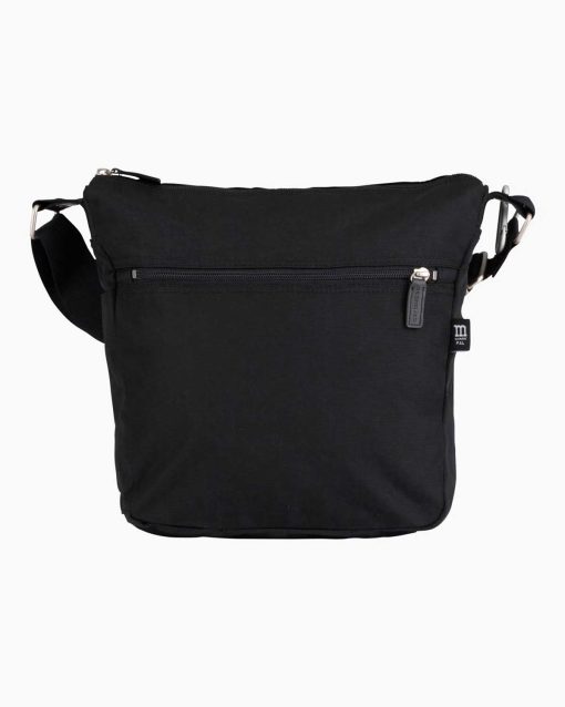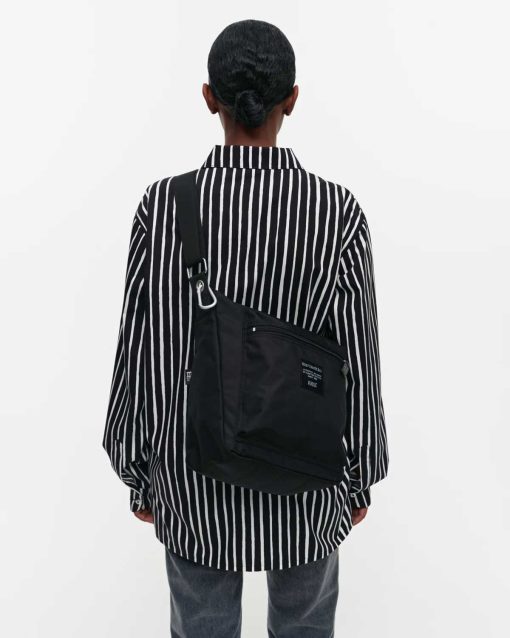 The Pal shoulder bag is made of recycled polyamide. The bag has a zipper closure, two zipper pockets on the outside, one slip-in pocket on the side, and a zipper pocket on the inside. The adjustable shoulder strap is made of nylon, and it has a metal clip hook for hanging small items.