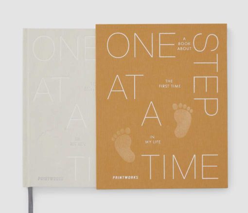 Discover „One Step at a Time: A Book About the First Time in My Life“. This beautiful beige book contains 64 pages and is housed in a rusty yellow slipcase, and it is your special place to record those magical moments of your baby’s first year. From pregnancy and birth to those memorable first words and steps, „One Step at a Time“ is the perfect book to document and cherish these moments forever.