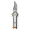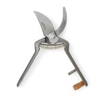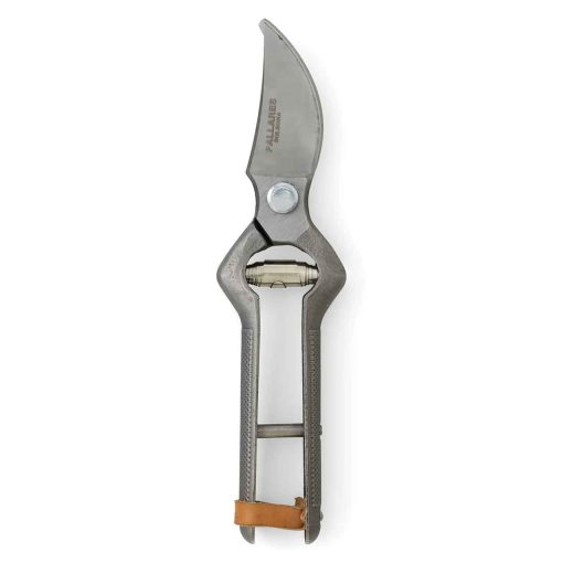Intended for everyday gardening use to trim larger branches and stems, the pruner has an ergonomic grip and leather safety fastener. A handmade leather holder fitted with a belt loop ensures the safe storage of the tool when not in use. The natural leather will develop a rich patina over time. The Pruner and holder are packaged in a wooden crate.