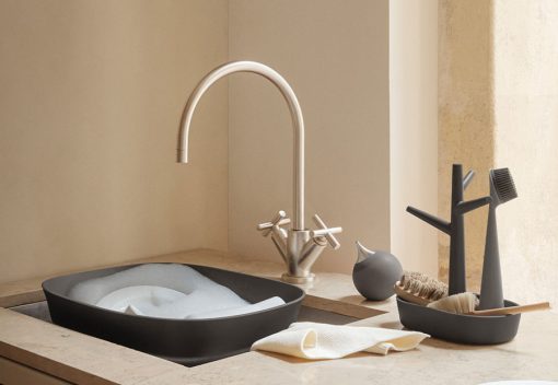 No more clutter by the kitchen sink. A decorative and practical organiser for your dishcloth, washing-up sponges, brush and detergent, with built-in hygiene because the brush and dishcloth can dry on the rack. Water can be easily drained from the collecting tray. Must be washed by hand.