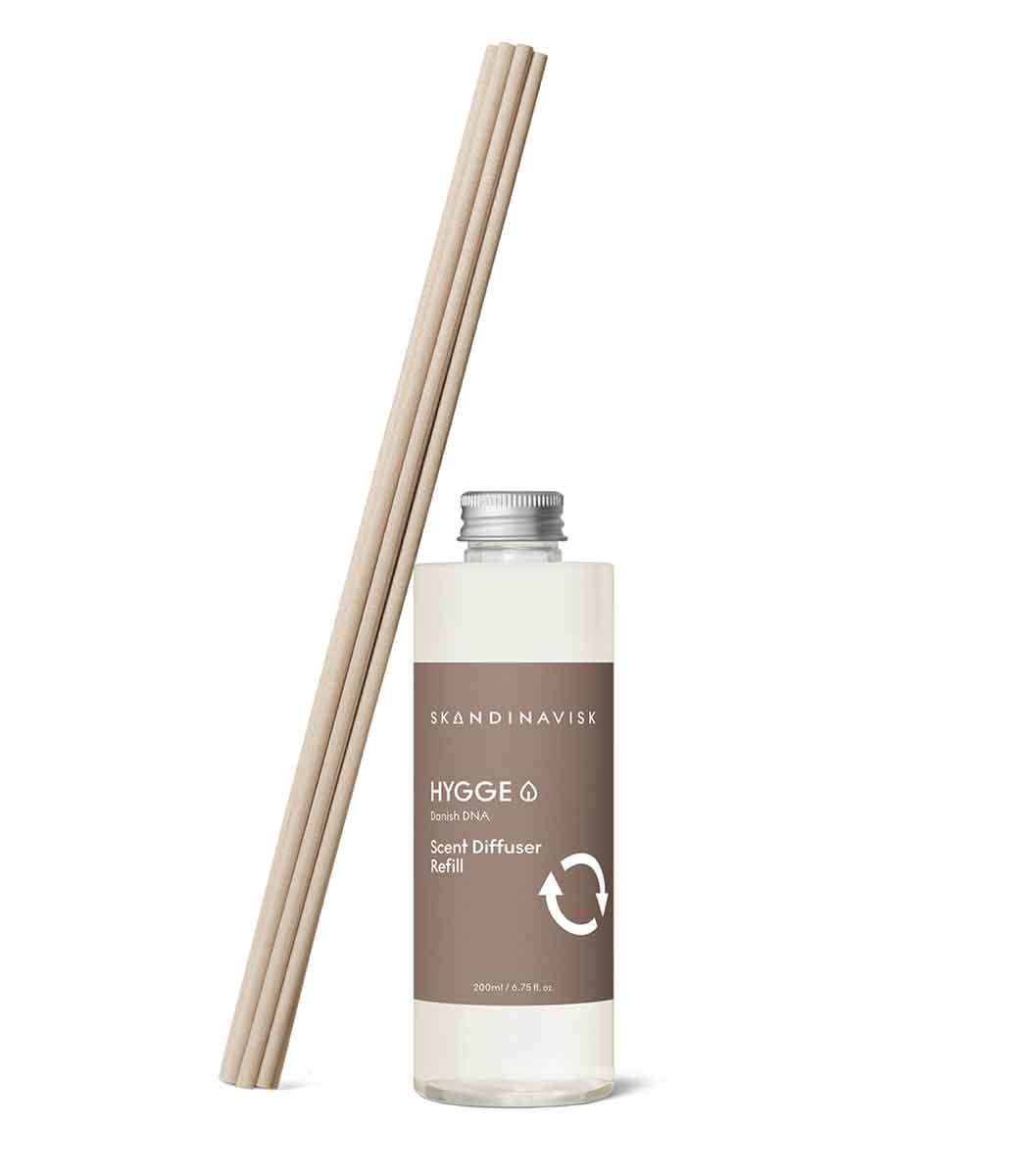 Just pour the refill carefully into the Skandinavisk glass, replace the reeds, then rinse and recycle the empty refill bottle. The FSC-certified packaging card is printed using natural colour dyes and can also be recycled.