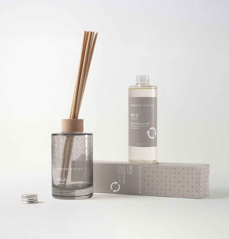 The new Skandinavisk diffuser collection blends Scandinavian fragrance stories with renewably farmed vegetable oils inside a painted glass vase that is designed to be refilled for up to 3 additional months of gentle and responsible room fragrance.
