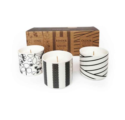 Gjafasett sem inniheldur 3 mismunandi ilmkerti. kertaglösin er tilvalið að endurnýta eftir að kertið hefur brunnið upp s.s. sem kaffibolla, teljós eða líitð ílát.