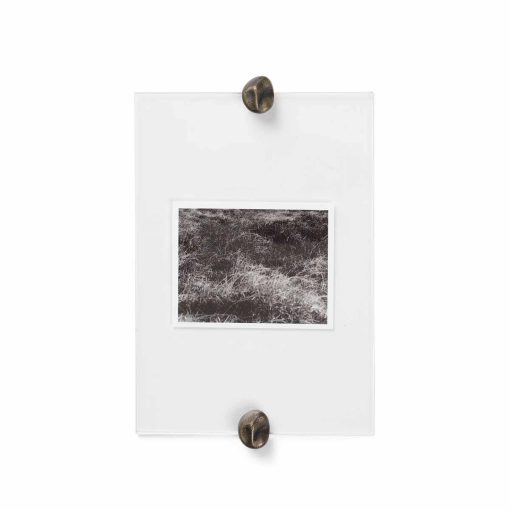 Elevate your space with a touch of sophistication and personal flair using the Gravel Picture Frame. This exquisite, modern frame comprises two sheets of acrylic, seamlessly connected by sculptural, cast brass brackets resembling small pieces of gravel. To display your chosen picture, effortlessly affix the two brass brackets onto the wall. Insert the picture between the two acrylic sheets, and then secure it by placing the cast brass caps onto the brackets. Your picture is now elegantly and securely framed.