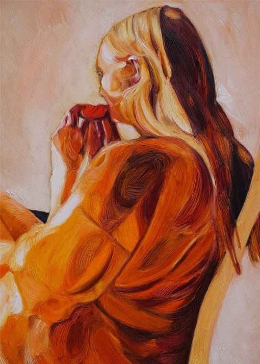 Warm tones and a soothing atmosphere defines Blood Orange by Copenhagen based artist Lolita Pelegrime. Dressed in a rich orange bathrobe a single female figure is bathed in warm morning sunlight, slowly eating a single slice of blood orange. A unique combination of thick textures capture a simple everyday moment, highlightingPelegrime’s ability to translate quite moments into engaging and beautiful compositions.