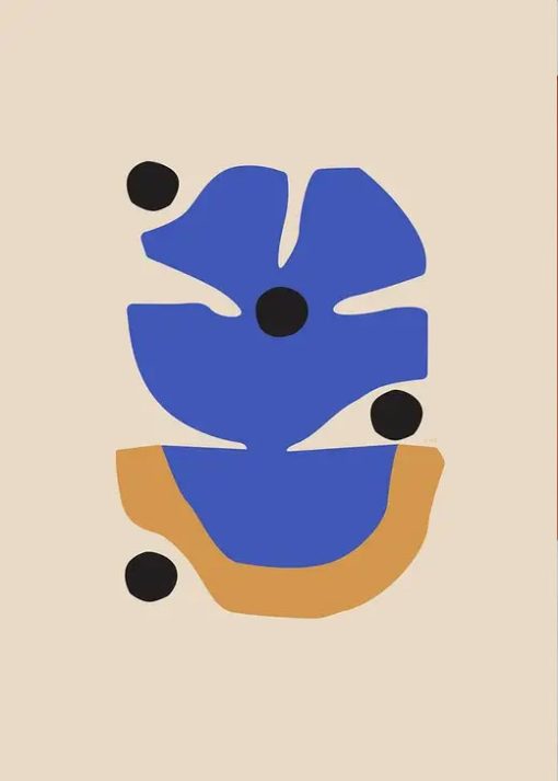A single flower in warm yellow and vibrant indigo blue forms the centerpiece of Flor Azul by Mexican artist Berenice Hernandez. Recalling the streets of her youth, the motif is a graphic representation of the plant filled urban landscapes she grew up around in southern and central Mexico. Set against a warm backdrop in beige, the flower floats in and around four black dots that ground the composition. A simple, yet bold expression of colour and life.