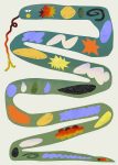 Slowly slinking its way up this playful scene, Green Snake by English artist Imogen Crossland features hand-cut forms inspired by the French artist Henri Matisse. The snakes angular shape is softened by shades of green and a wiggly tongue, completed by a group of playful motifs all over its body, including stars, clouds, raindrops and explosions.