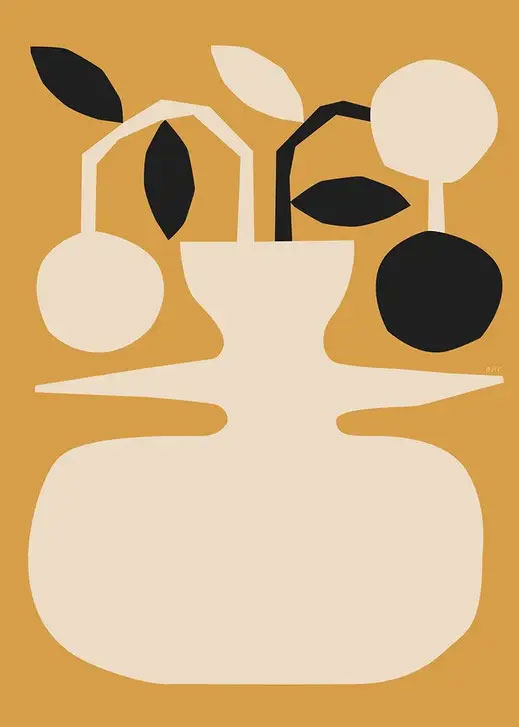 Celebrating the vibrancy of her local urban environment, Jarrón by Berenice Hernandez centers around the terracotta pots that line the streets and lanes of many Mexican neighborhoods. Presented through a structural graphic illustration, two stems extend from an organic shaped pot – shades of beige and black popping against a rich warm yellow backdrop. Complete with fruit, this illustration is bold and graphic, whilst appearing visually light.
