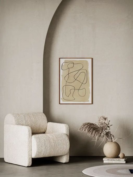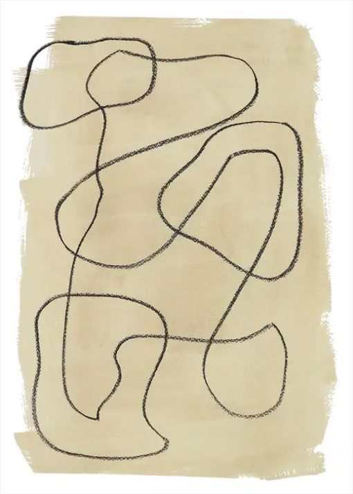 Delicate lines and brushed texture combine in Berit Mogensen Lopez’ artwork Wiggle. The Danish artist has combined a bold painted background in a textured beige, with a thin charcoal line that moves throughout the composition. Bringing together fine details and broad brushstrokes, Wiggle creates an immersive yet soft centerpiece.
