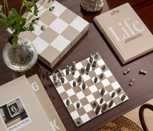A beautiful special edition and larger variant of our Classic Chess now in a spectacular mirror design. The pieces and board are made of wood and a thin layer of mirrored acrylic is mounted on the board’s surface giving the pieces an effective reflection. The box is made of high quality art paper and has the construction and open up as a book, which means it also fits perfectly lined up together with your art books in a shelf. The cover is printed with a checkered silver foil mimicking the mirror effect.