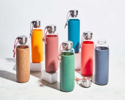A 600ml / 20 fl oz Borosilicate glass bottle with a protective non-slip sleeve, convenient carry loop and full glass and Stainless steel contact with water.