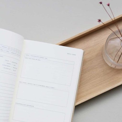 The Care Journal is a place to easily check in with yourself daily. It provides space to explore and reflect upon your thoughts and feelings for the day, your intentions for tomorrow, and your general well-being.