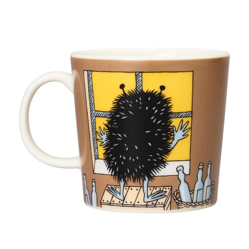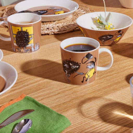 Stinky is the crook of Moominvalley but rather loveable all the same. In the brown Stinky in Action Moomin mug from the Moomin Classics Collection, a playful dog is running around Moominvalley, and it has stolen Moominmamma’s handbag. Stinky catches the dog by the tail, and the dog lets go of the bag. According to Stinky, Moominmamma gets her handbag back because there’s never any money in it.