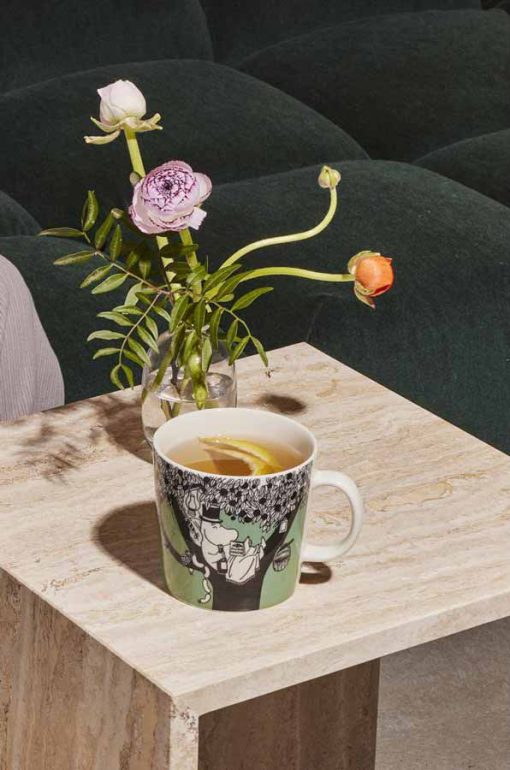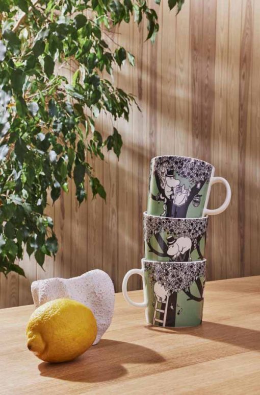 The motif on the Moomin Mug Green is based on the cartoon series where the inhabitants of Moomin Valley begin to live freely on nature’s terms. The Moomin dad moves to a tree where he feels free like a bird in the air. Back to nature, ignore all obligations! Mug Green, designed in Arabia’s Teema shape, now in a new, larger size.