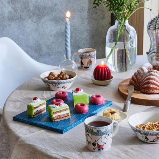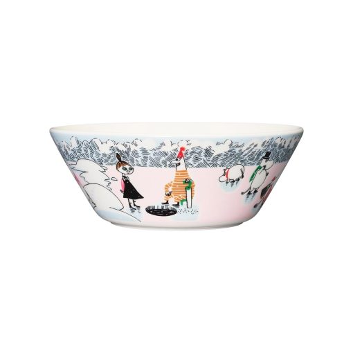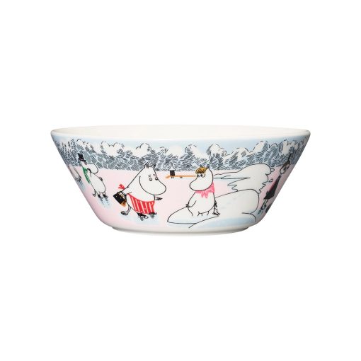 The seasonal Winter Wonderland bowl depicts the arrival of Mr Brisk, a curious character who loves winter sports above all else. He encourages the inhabitants of Moominvalley to try out various winter sports. Mymble wants to be an ice princess and practises ice skating in secret at night. The Moomins, however, do not learn to skate.
