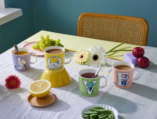 On the E mug, Moomins meet Mr Brisk, a sports nut. His endless athletic energy does not please Moomintroll, but for Mymble, it’s love at first sight. The illustration on the back side of the larger mug is inspired by the comic “Moomin’s Winter Follies”. Moomin by Arabia, mug 0.4 l, ABC E