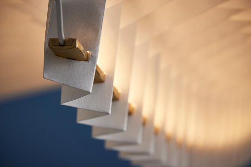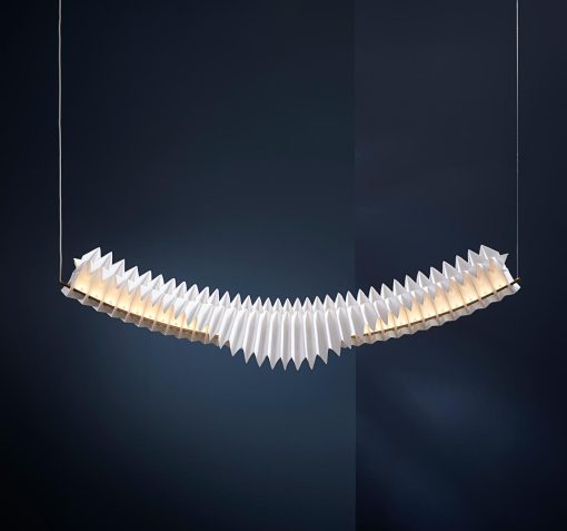 When contrasted with Sora’s delicate, paper-like construction, the diffused effect of the linear LED light embedded within the luminaire’s construction creates an ethereal glow with an intangible quality. Designed by visionary design practitioners, Fung + Bedford, a UK-based duo working exclusively with the art of origami folding techniques, Sora is a formal continuation of the duo’s creative practice, which succeeds in seamlessly blending architecture and design.