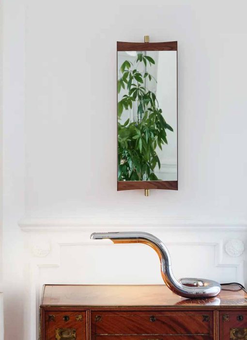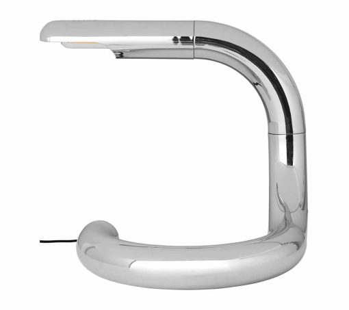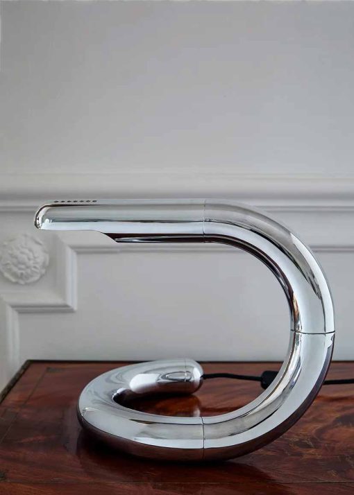 Serpentine in shape, beautifully balanced and gleaming like a jewel, the Aspide Lamp by Gianfranco Frattini is both a brilliantly practical piece of industrial design and an irresistibly playful design statement. First developed in 1970, the Aspide is a highly adjustable table lamp that looks like no other light before or since, but which still expresses the material and aesthetic tastes of its time. The Aspide was designed as a versatile task lamp that can be manually adjusted to create either direct light for work or reading, or turned toward the wall to create a softer, ambient glow; infact the body of the lamp can be manually rotated 350o in both the neck and the head.