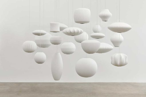 Designed by George Nelson in 1947, the Nelson Bubble Pendant Lamp series comprises a range of pendant lighting solutions with varying spherical silhouettes. Inspired by a set of silk-covered Swedish hanging lamps, the lamps’ organic shapes appear to delicately float overhead, offering a soft and atmospheric light. Available in Ball, Pear, Apple, Cigar, Saucer, Lantern and Propeller variants in different sizes.