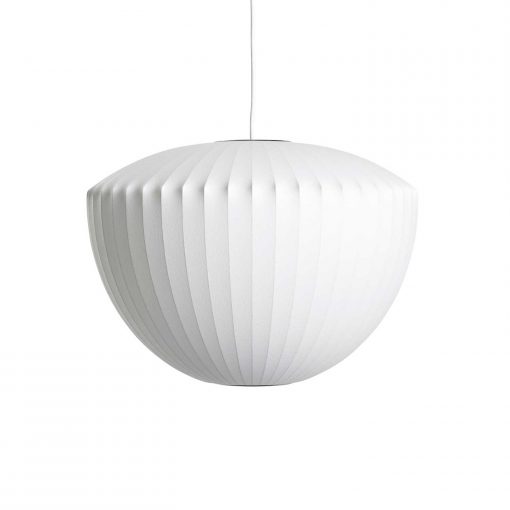 Part of the Nelson Bubble Lamp series, the Nelson Apple Bubble Pendant has a clean, rounded symmetry. It comes with a steel ceiling plate, from where it floats overhead, casting a soft, even light. George Nelson designed the series in 1952. He was inspired by a set of silk-covered Swedish hanging lamps.