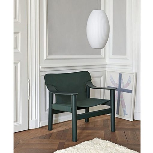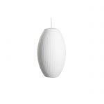 Part of the Nelson Bubble Lamp series, the Nelson Cigar Bubble Pendant has the rounded shape of its namesake, with clean parallel lines accentuating its spherical silhouette. The lamp comes with a steel ceiling plate, which allows it to it delicately float overhead. George Nelson designed the Bubble Lamp series in 1952.