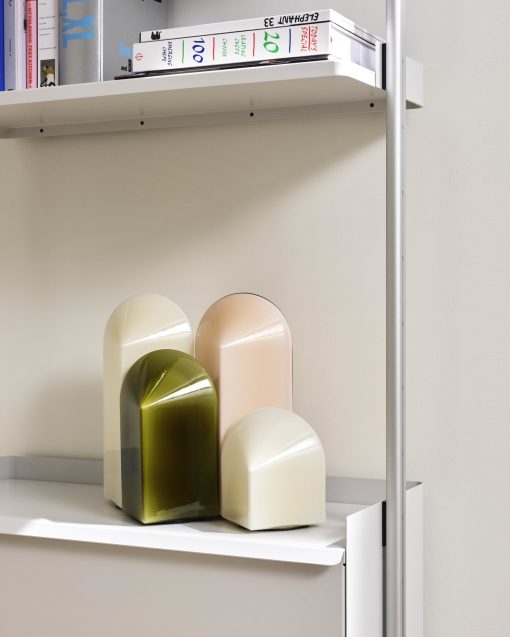 Designed by Viola Heyn-Johnsen and Jonas Trampedach, Parade Table Lamp is a sculptural lamp with a distinctive geometric shape that changes the lamp’s expression whichever angle it is turned. Comprising a square base and arched top in coloured glass, it features a custom, integrated LED light source with an inline step-dimmer. Carefully selected sizes and colours complement each other in height and tone, making the lights equally appealing as a group, a single lamp, or as a decorative ornament without the light switched on.