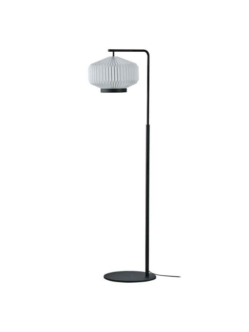 The Shibui floor lamp has a hand-pleated shade and black metal ring, as well as a black lacquered floor stand.