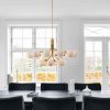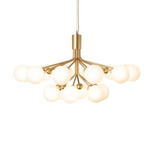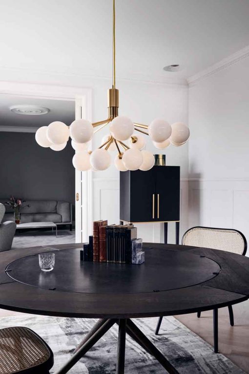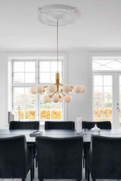 With inspiration from flowers, Sofie Refer has designed the Apiales collection. The collection consists of two chandeliers with 9 or 18 mouth-blown glass globes and are available in golden Brush Brass finish or the smooth Satin Black. From a specially-produced canopy, the arms unfold like flower stalks from which light is spread with grace. Apiales 18, with its 90 cm in diameter, fits as the centrepiece in the foyer, a large living room or over a large dining table. Ceiling plate included.