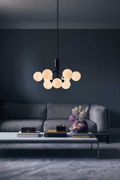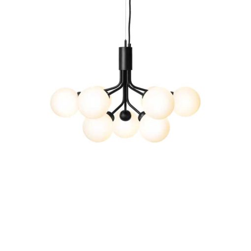 With inspiration from flowers, Sofie Refer has designed the Apiales collection. The collection consists of two chandeliers with 9 or 18 mouth-blown glass globes and are available in golden Brush Brass finish or the smooth Satin Black. From a specially-produced canopy, the arms unfold like flower stalks from which light is spread with grace. Apiales 9, with its 60 cm in diameter, fits over the dining table, in the bedroom, or in the hall.