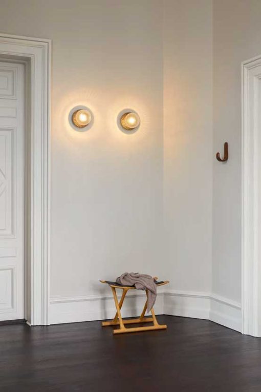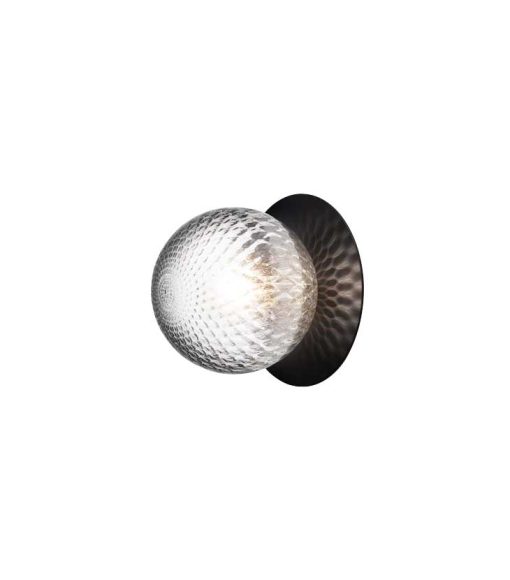 Liila 1 Medium is a single lamp, designed to be installed either as a wall or flushmount light. The lamp is simple in its form, consisting of a thin, round sheet of metal in black finish. A mouth-blown optic clear glass sphere is placed upon the metal backplate, reflecting the light through the glass. Liila 1 Medium offers light from either the wall or ceiling and is suitable in rooms with low hanging ceilings where a hanging fixture may not work.