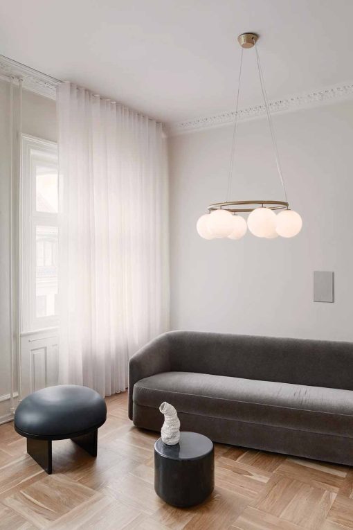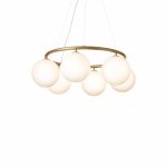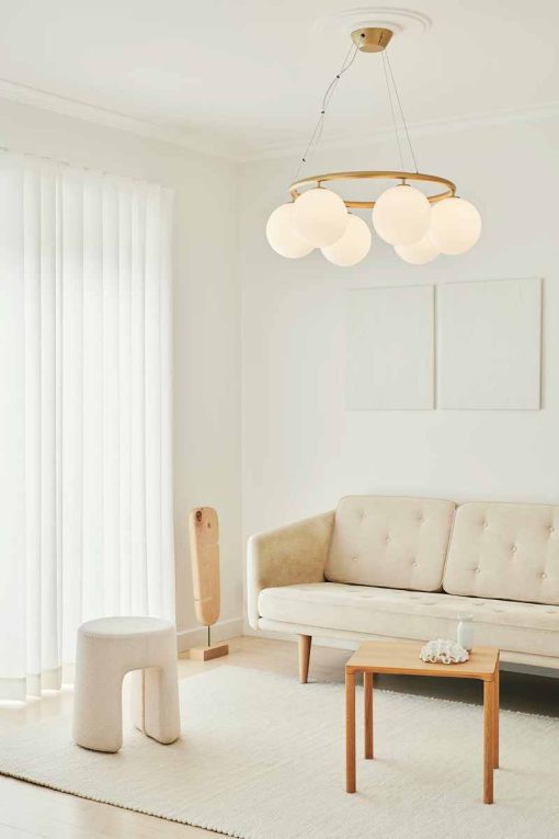Miira 6 Circular has a classic appearance and is designed to hang high or low from the ceiling. A special wire system is used to adjust the height with ease from 20 to 250 cm. The Miira chandelier comprises a powder-coated metal ring in a brass colour and, from this, mouth-blown glass domes in opal white glass spread a sensuous light. The simple, classic design makes this chandelier a useful element in many interior designs. It has a diameter of 80 cm, making it ideal for placing above a dining table or sofa. Ceiling plate included.