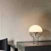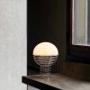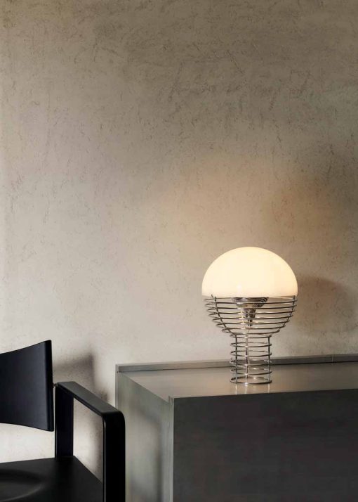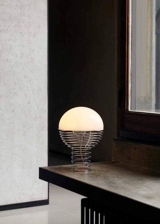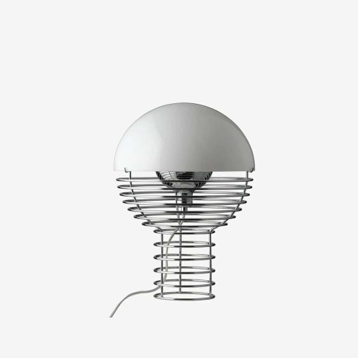 The decorative Wire table lamp is defined by the chrome-plated steel wire framework that widens at the top to support the white hemispherical plastic shade. The bulb is contained in a small, also hemispherical metal reflector, which guides the light to the inside of the shade. The wire frame gives the design a distinctive, yet very light and non-intrusive appearance, and the white shade offers plenty of ambient light.